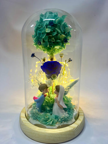 ROSA PRESERVADA CON LUZ LED + PAREJITA DE NOVIOS – 3 a 5 Años de Belleza Natural | Colores: Rojo, Azul, Púrpura, Rosado
