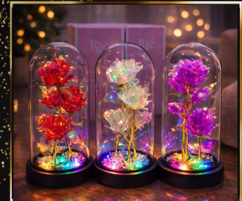 ROSA ETERNA CON CÚPULA DE CRISTAL – Plástico Tornasolado + Luces LED + Funciona con Pilas